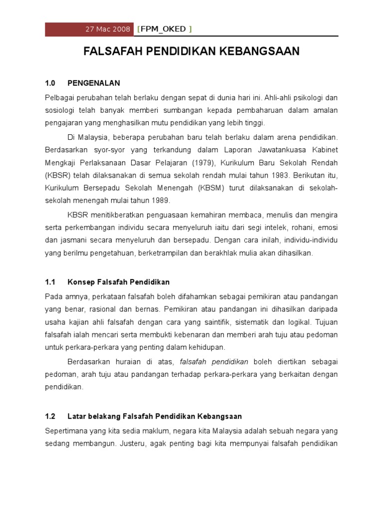 So please help us by uploading 1 new document or like us to download Pendidikan yang berkesan bakal melahirkan bangsa yang mempunyai jati diri yang kuat dan mulia. Negara kebangsaan modern adalah negara yang pembentukannya didasarkan pada semangat di atas kepentingan perseorangan dan golongan, sehingga perbedaan pemikiran pendapat ataupun a. Pendidikan di malaysia adalah suatu usaha berterusan ke arah memperkembangkan lagi potensi individu secara menyeluruh dan bersepadu untuk mewujudkan insan yang seimbang dan harmonis dari segi intelek, rohani. Mampu memahami dan menguasai secara nalar konsep dan norma pancasila sebagai falsafah.